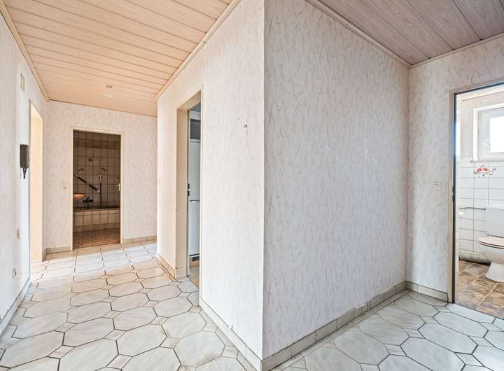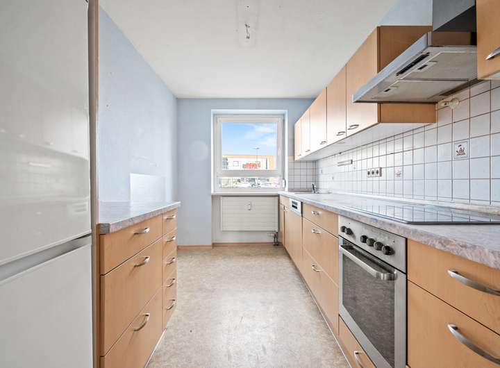 Bereits beim Betreten der Wohnung über den zentralen Flur fällt die durchdachte Raumaufteilung auf: rechts befinden sich das separate WC und die geschlossene Küche, die mit ihrer praktischen Form ausreichend Platz für Stauraum und Arbeitsflächen bietet. Daneben liegt das Kinderzimmer, das sich auch hervorragend als Büro oder Gästezimmer eignet.