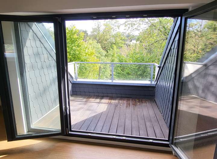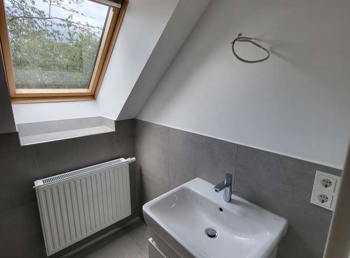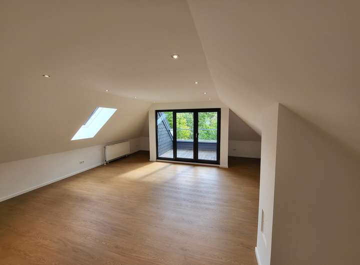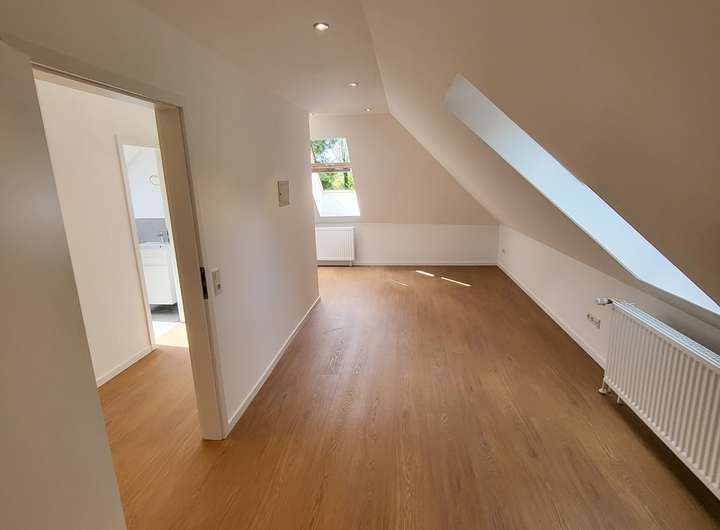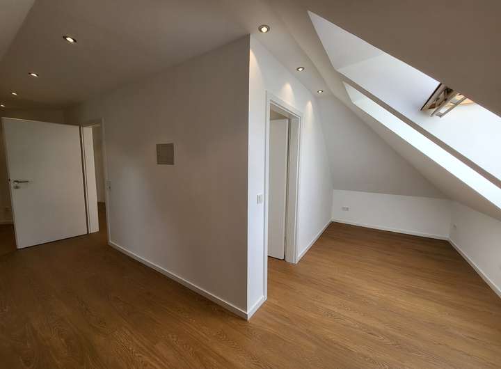 Das Obergeschoss wurde im Jahr 2025 ausgebaut und verfügt über drei Zimmer sowie ein frisch renoviertes Badezimmer. Geht man die Treppe hinauf ins Obergeschoss betritt man einen Flur, von dem als erstes ein 48 qm-großer Raum abgeht, der sich als Elternschlafzimmer anbietet. Hier gibt es eine Loggia mit Südausrichtung und einem schönen Blick ins Grüne. Von dem Schlafzimmer geht ein weiterer Raum ab, der als Ankleidezimmer oder als Kinderzimmer genutzt werden kann.