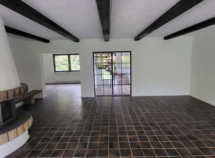Von dem großen Eingangsbereich betritt man durch eine doppelflügelige Lofttür den weitläufigen Wohnbereich. Von dort hat man einen herrlichen Ausblick auf die Terrasse und den Garten. Der große Kamin sorgt für behagliche Abende. Weiterhin garantiert die Terrasse mit einer Süd-West-Ausrichtung einen gemütlichen Aufenthalt im Freien.