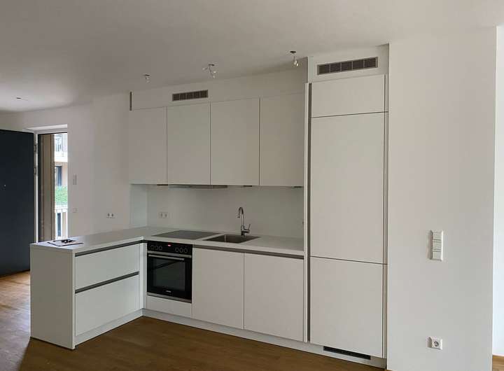 Das Apartment bietet viele Annehmlichkeiten, darunter eine moderne Einbauküche, die mit einem Kühlschrank, Herd und genügend Stauraum ausgestattet ist. Der Fußboden ist mit hochwertigem Parkett ausgelegt, und die Fußbodenheizung sorgt für eine angenehme Wärme. Der Balkon bietet einen schönen Blick auf den Innenhof. Weitere Annehmlichkeiten sind ein Aufzug und ein Keller für zusätzlichen Stauraum.