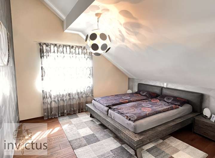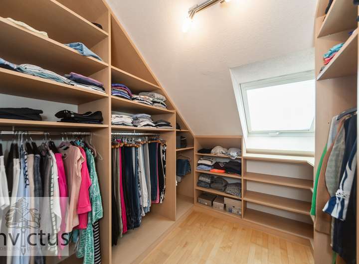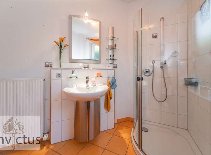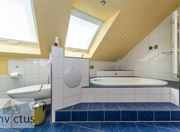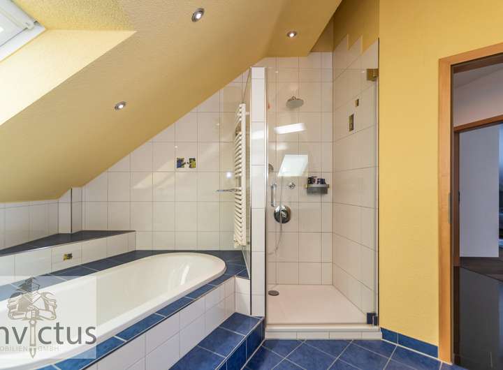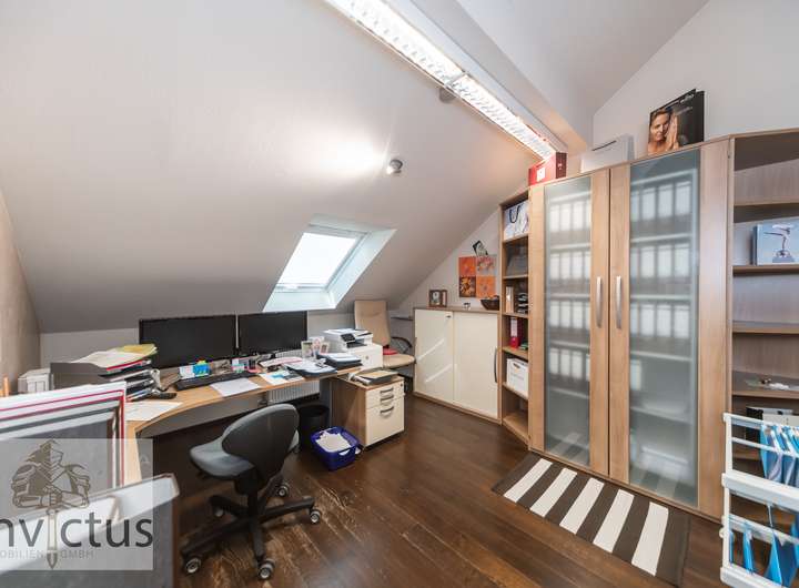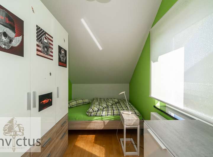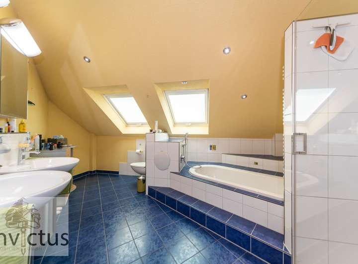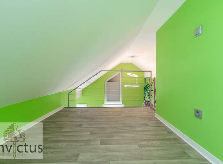Im Obergeschoss erwarten Sie zwei geräumige Schlafzimmer, die viel Platz für individuelle Einrichtungsideen bieten. Das modern ausgestattete Badezimmer überzeugt mit einer Badewanne und einer separaten Dusche, die für zusätzlichen Komfort sorgen. Ein weiteres Bügelzimmer bietet zusätzlichen Raum für funktionale Aufgaben. Der gedämmte Dachboden, der über Datenleitungen verfügt, bietet zudem weiteres Ausbaupotenzial.
