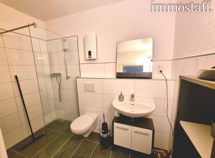 Die Wohnung verfügt über ein modernes Bad (barrierefreie Dusche), das mit geschmackvollen Fliesen und zeitgemäßen Sanitärobjekten ausgestattet ist.