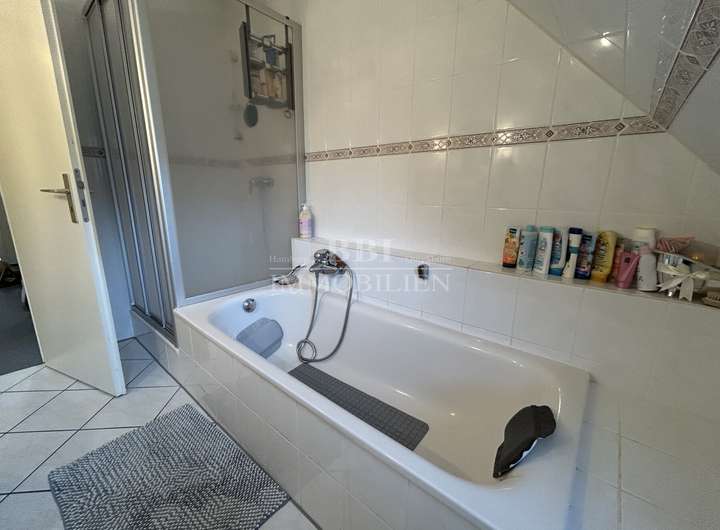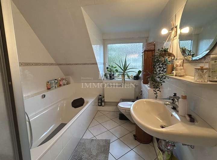 Im Obergeschoss befinden sich drei Zimmer sowie ein helles, ansprechendes Vollbad mit Badewanne, separater Dusche und Fenster. Der Flur im Obergeschoss ist mit Auslegware und die Zimmer sind mit Fußboden in Holzoptik versehen.