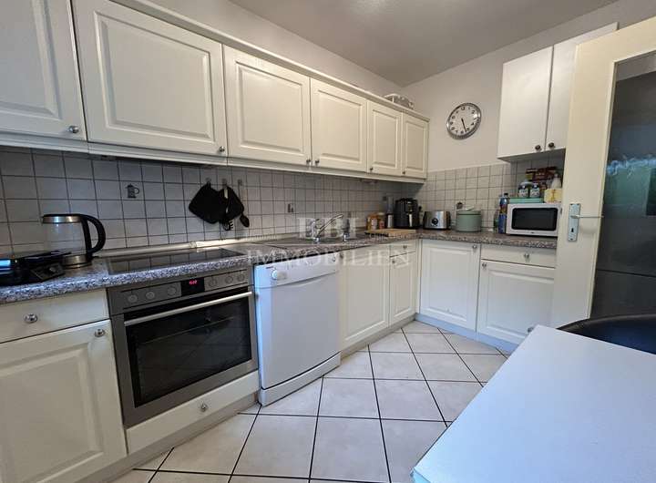 Die Fußböden in der Diele, im Gäste-WC und in der Küche sind mit hellen, einheitlichen Fliesen ausgestattet. Die Einbauküche verfügt über Ober-/Unterschränke, einen Backofen sowie einem Cerankochfeld - der Dunstabzug führt nach außen. Der Wohn- und Essbereich ist mit einem attraktiven Bodenbelag in dunkler Holzoptik versehen.