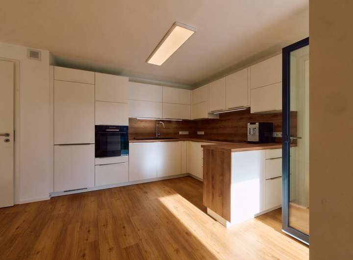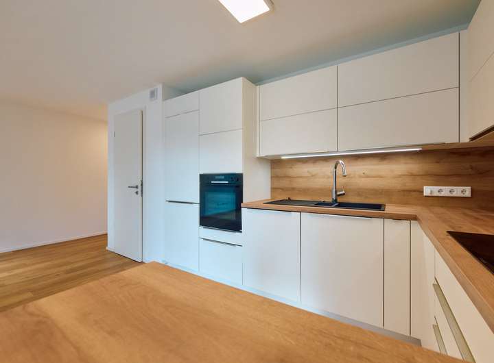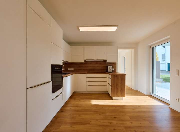 Der offene Küchenbereich lädt zum gemeinsamen Kochen ein und verfügt über eine hochwertige, moderne Einbauküche. Dank der durchweg hochwertigen Ausstattung fühlt man sich in dieser bezugsbereiten Wohnung sofort wohl.