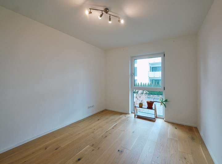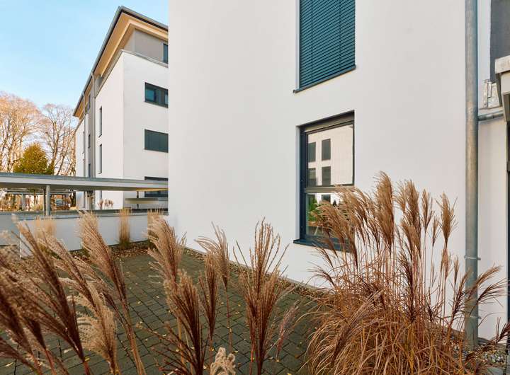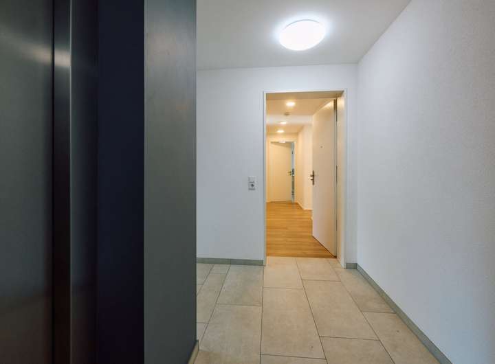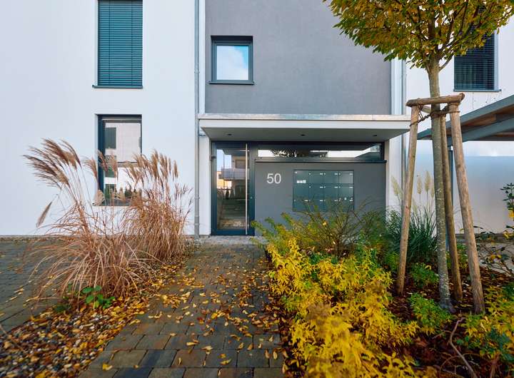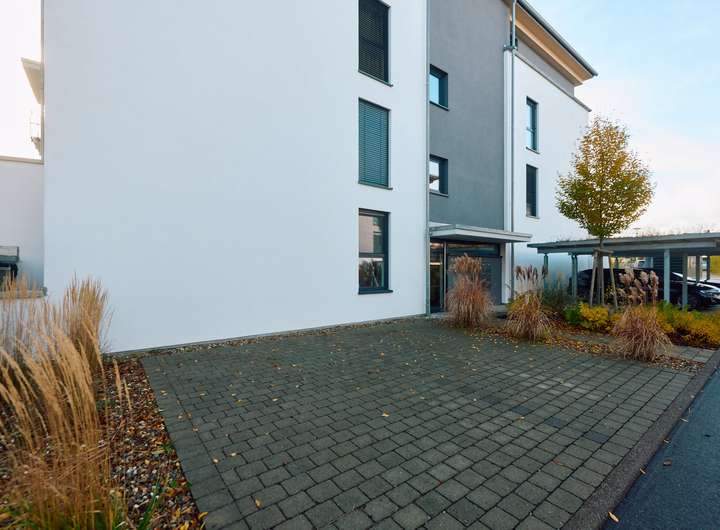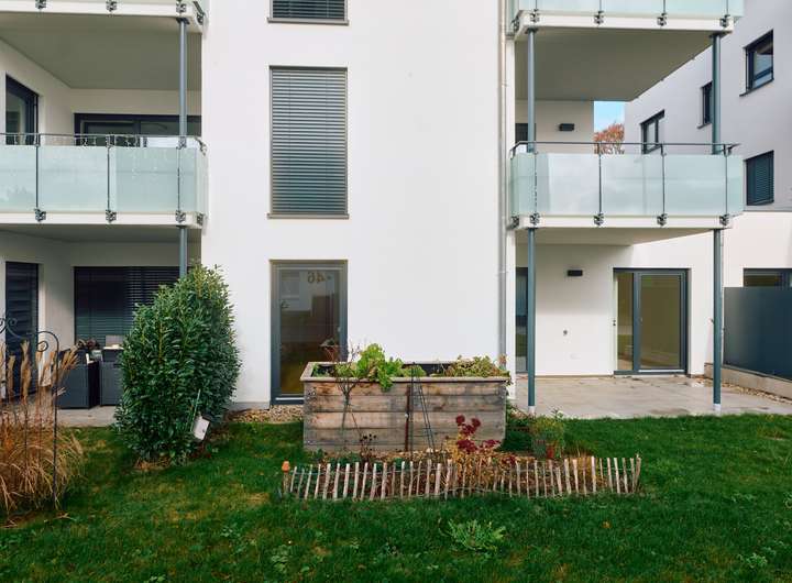 Die Wohnung befindet sich im Erdgeschoss, das aufgrund der leichten Hanglage ein halbes Geschoss über dem Eingangsbereich liegt. Dieser ist bequem und mühelos über den Aufzug erreichbar. Ein großzügiger Gartenanteil erweitert den Wohnraum nach draußen und bietet Platz für entspannte Stunden an der frischen Luft.