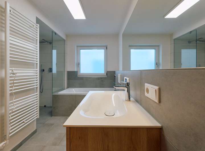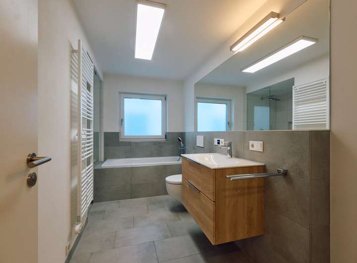 - modernes Bad mit bodenebener Dusche, Badewanne, integriertem Radio sowie weiteren attraktiven Ausstattungsdetails
