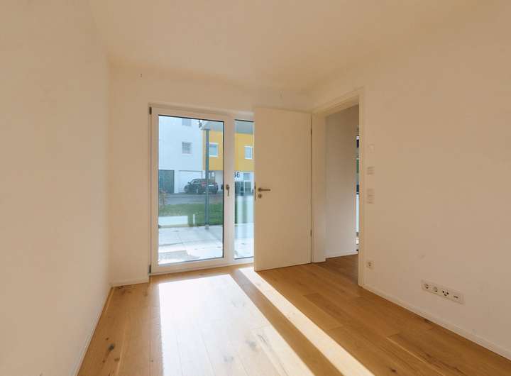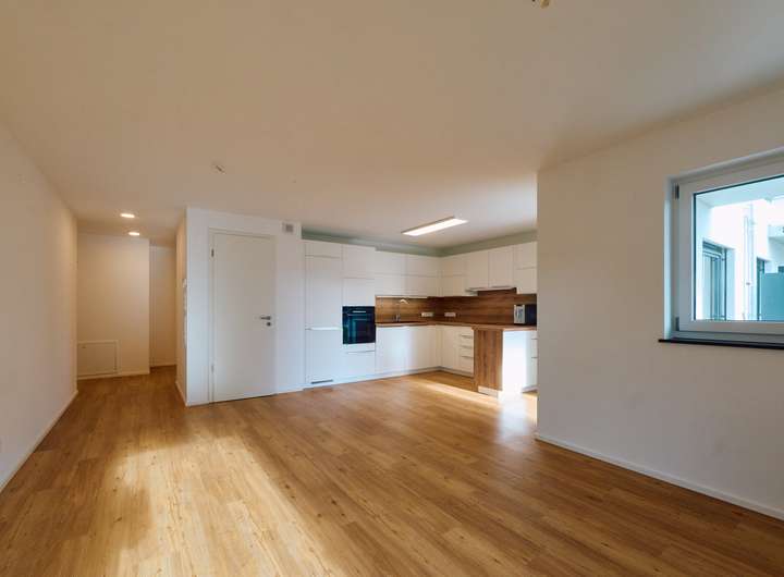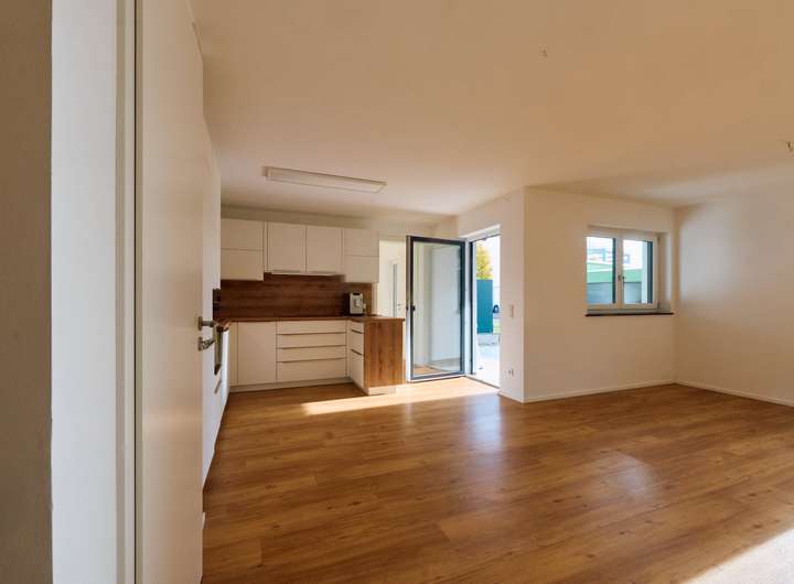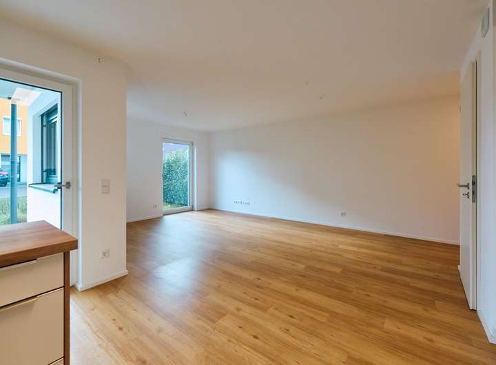 Der offene Küchen-, Wohn- und Essbereich bildet das Herzstück der Wohnung. Von hier aus gelangen Sie direkt auf Ihre sonnige Terrasse sowie in Ihren eigenen kleinen Gartenbereich. Hier können Sie sich Ihr kleines eigenes Reich schaffen und beispielsweise frische Kräuter im eigenen Hochbeet ernten.