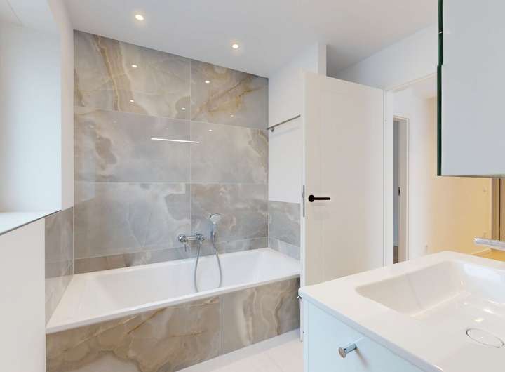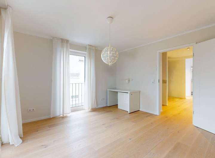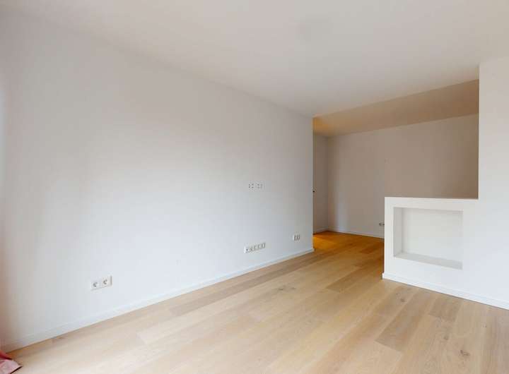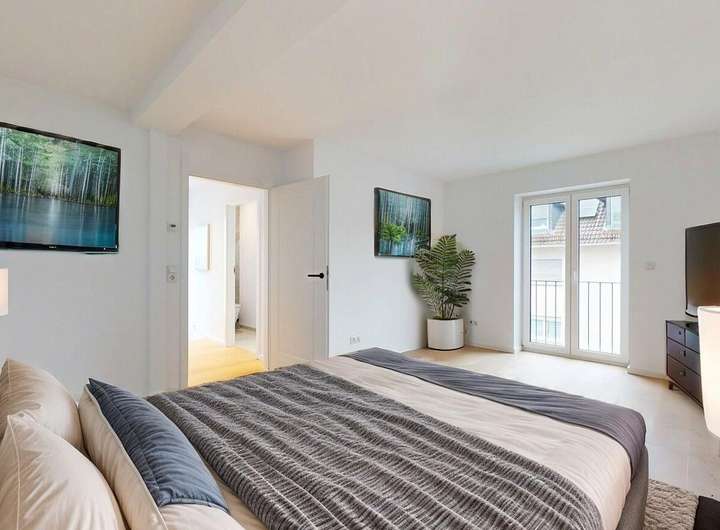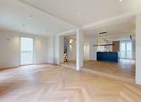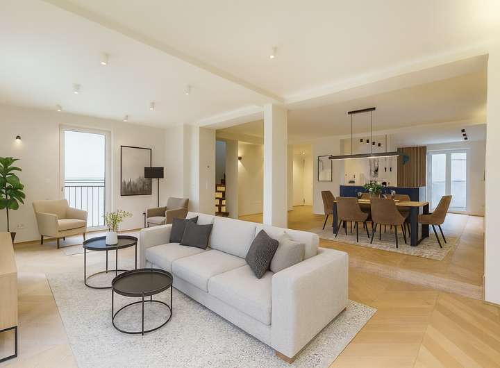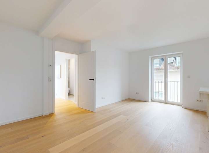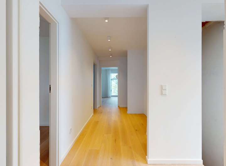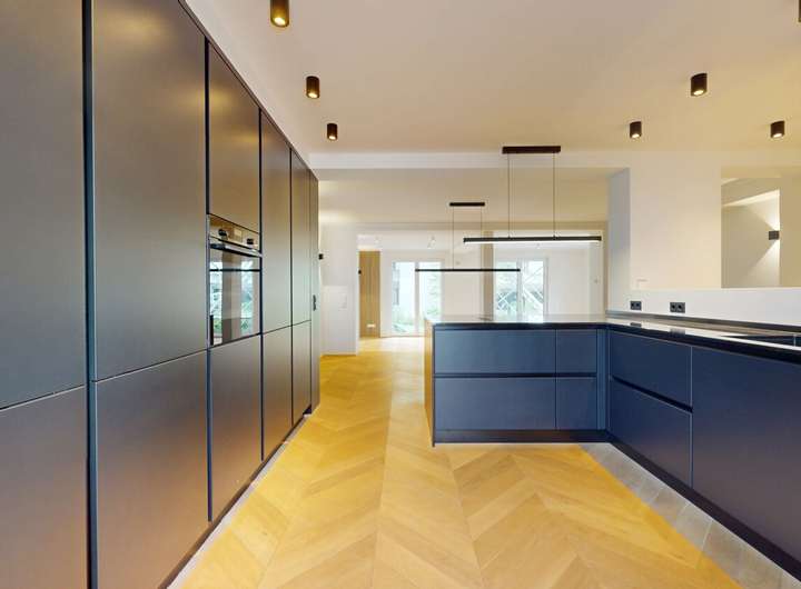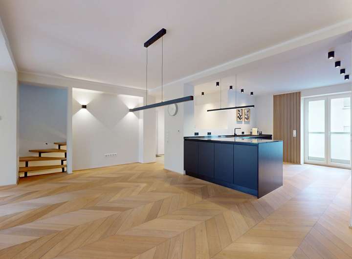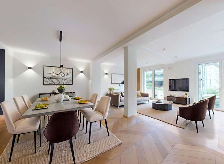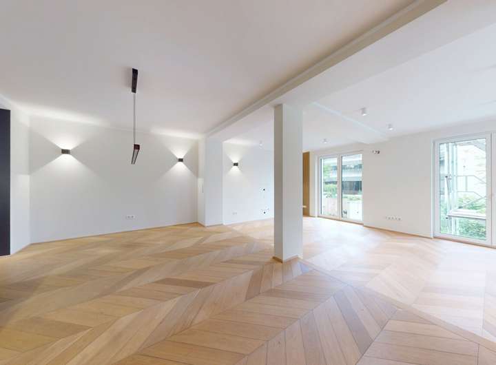 Nur eine Stufe tiefer öffnet sich das großzügige Wohnzimmer, ausgestattet mit edlem französischem Fischgrätparkett, bodentiefen Fenstern und Blick in den Garten. Ein durchdachtes Beleuchtungskonzept mit Downlights sorgt für eine helle, moderne und zugleich wohnliche Atmosphäre. Optional lassen sich hier ein Balkon oder ein direkter Gartenzugang realisieren – zusätzliche Gestaltungsmöglichkeiten mit hohem Potenzial.
