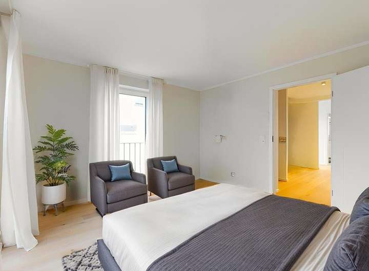 Eine schlichte, elegante Holztreppe führt ins Obergeschoss, das den privaten Bereich mit Schlafzimmern und einem geschmackvoll ausgestatteten Tageslichtbad beherbergt.