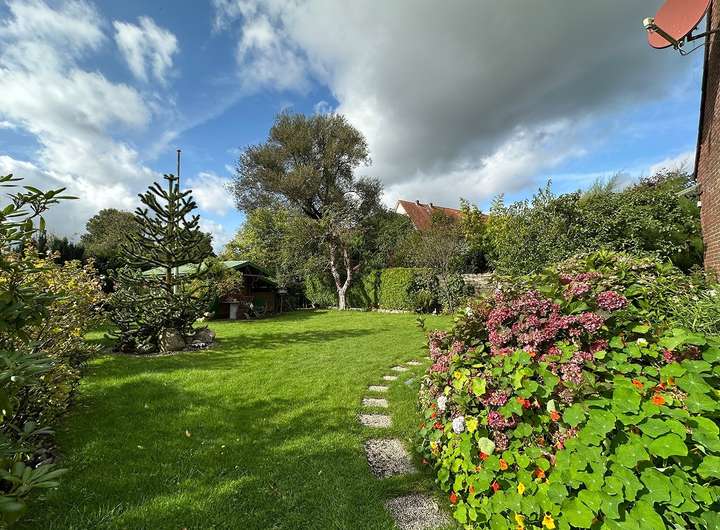 Das Grundstück umfasst eine Fläche von ca. 586 m² und verfügt somit über ausreichend Platz, um der Kreativität freien Lauf zu lassen. Der Garten ist pflegeleicht angelegt und wird durch ein kleines Gartenhaus vervollständigt.
