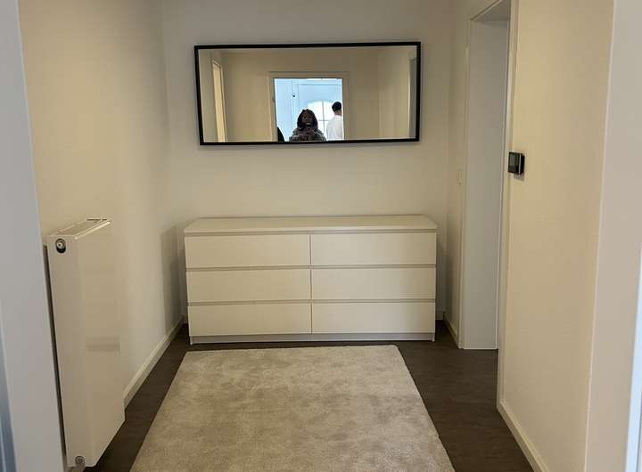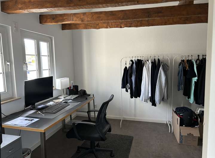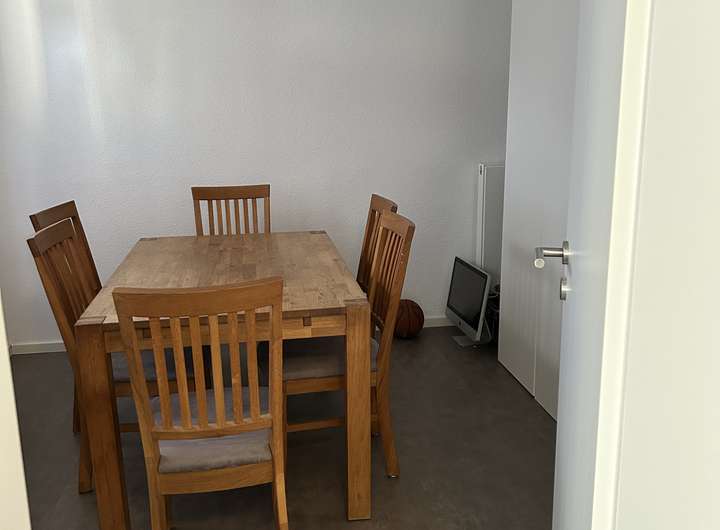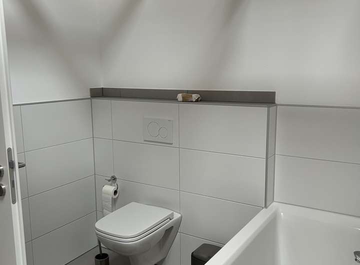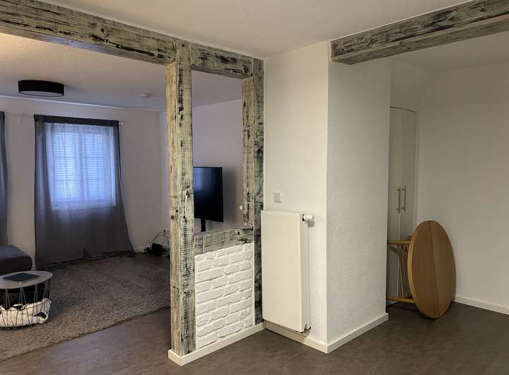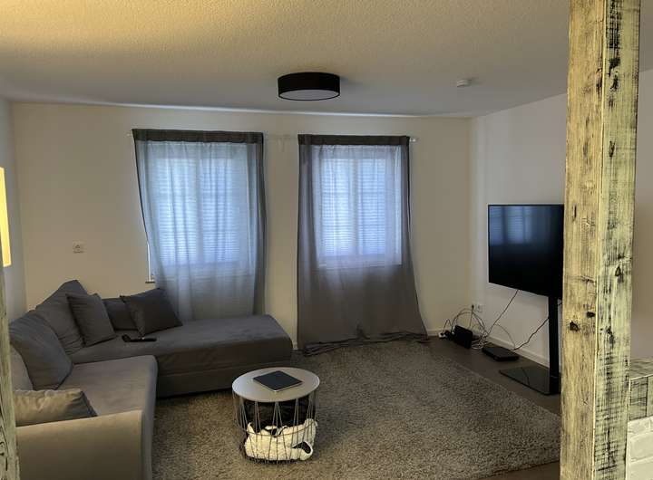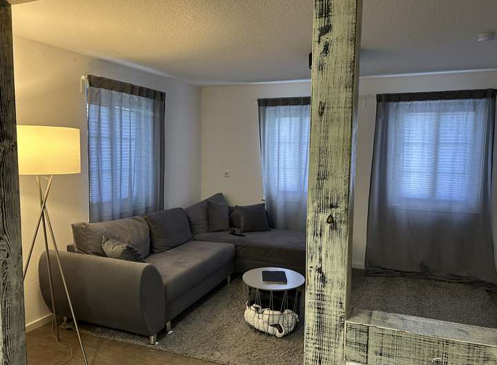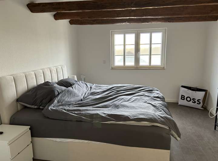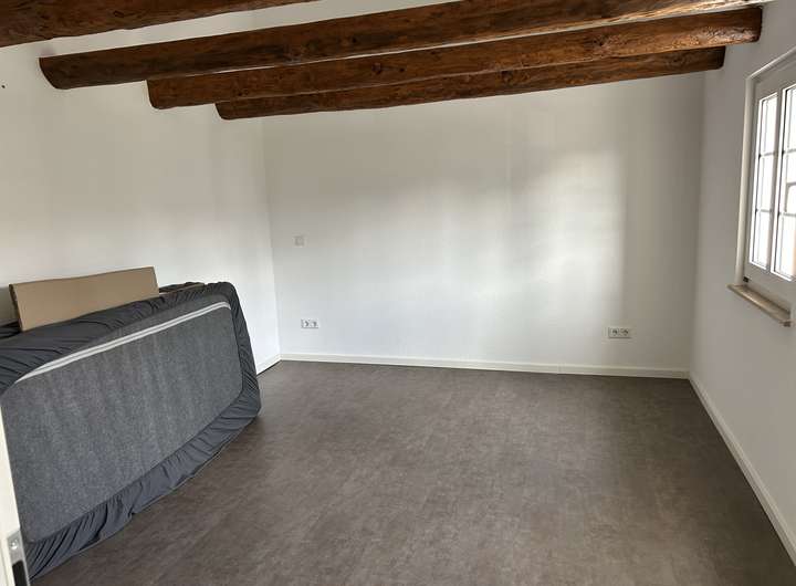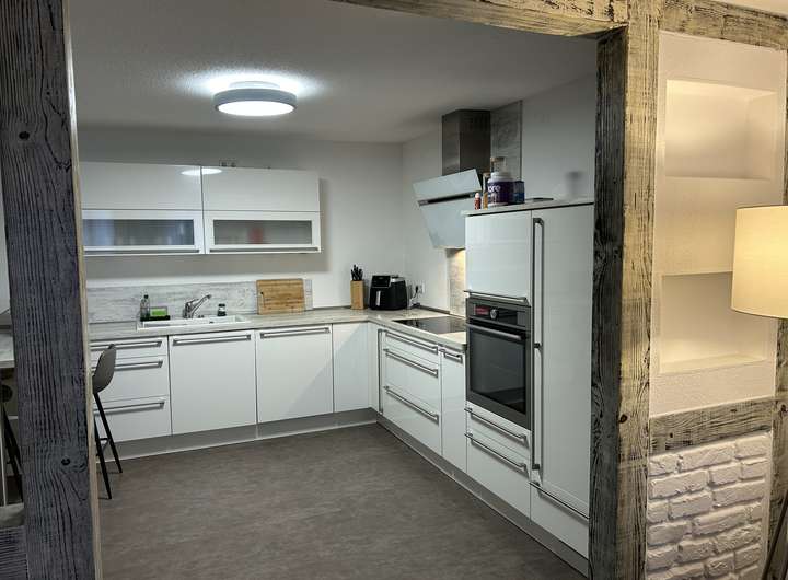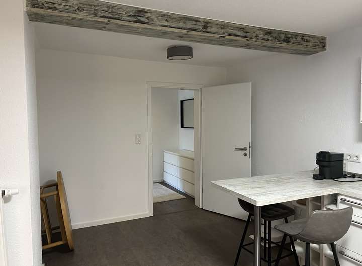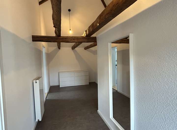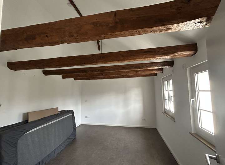 Bei der zu vermietenden Immobilie handelt es sich dem Grunde nach um ein Einfamilienhaus, welches zu einem Ensemble gehört. Selbstverständlich verfügt die Immobilie über einen eigenen Eingang. Im EG befindet sich ein Bad, in dem Waschmaschine und Trockner ebenfalls ihren Platz finden. Ebenso gibt es ein Zimmer, welches derzeit als Esszimmer genutzt wird und den großzügigen, offenen Wohnzimmer/Küchenbereich, der durch eine sehr schöne Balkenkonstruktion unterbrochen ist. Die Küche verfügt über eine moderne Einbauküche mit allen Elektrogeräten.