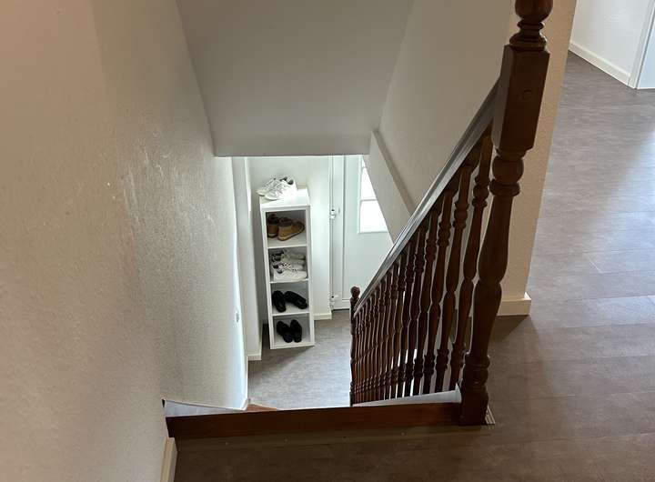 In das obere Geschoss führt eine sehr schöne Holztreppe. Hier finden sich das großzügige Hauptbad mit 2 Waschbecken, Dusche und Badewanne. Ebenso befinden sich hier 3 weitere Zimmer, die derzeit als Kinderzimmer, Büro und Schlafzimmer genutzt werden. Auffällig sind hier die hohen Decken, die durch Holzbalken optisch hervorgehoben werden.