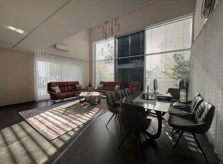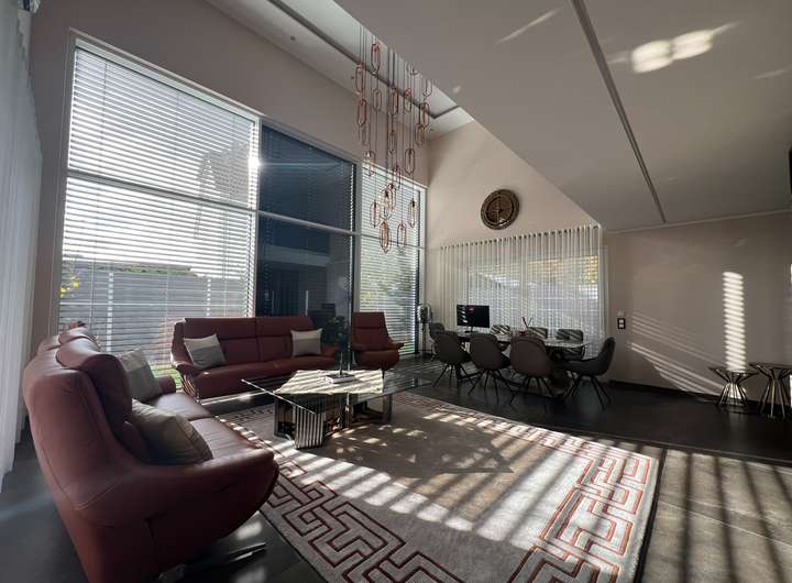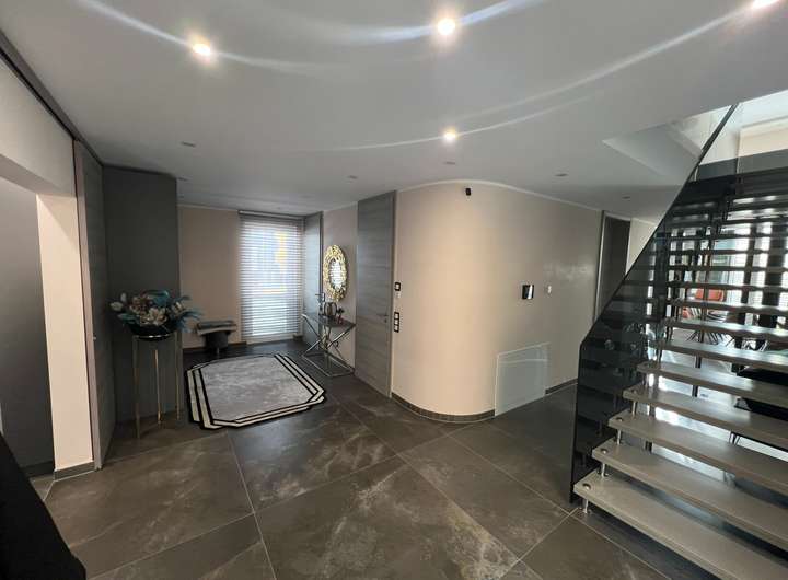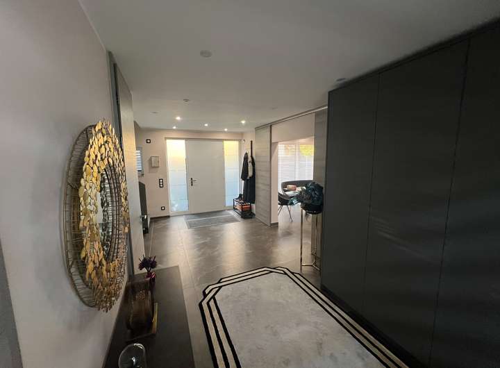 Die repräsentative Eingangshalle führt in den weitläufigen Wohnbereich, der durch seine offenen Strukturen, hohe Decke und elegante Gestaltung beeindruckt – ideal für gesellschaftliche Anlässe, Business-Empfänge oder das entspannte Familienleben. Große deckenhohe Fensterfronten schenken ein helles, freundliches Ambiente und bieten einen schönen Blick in den Garten.