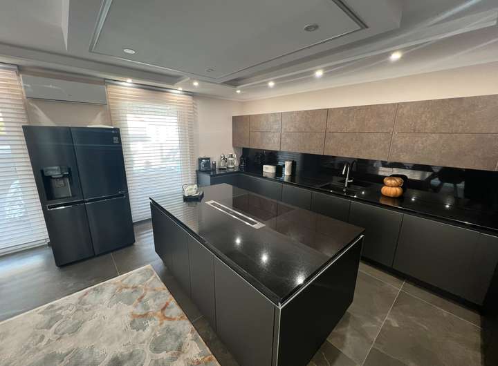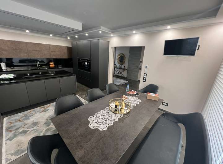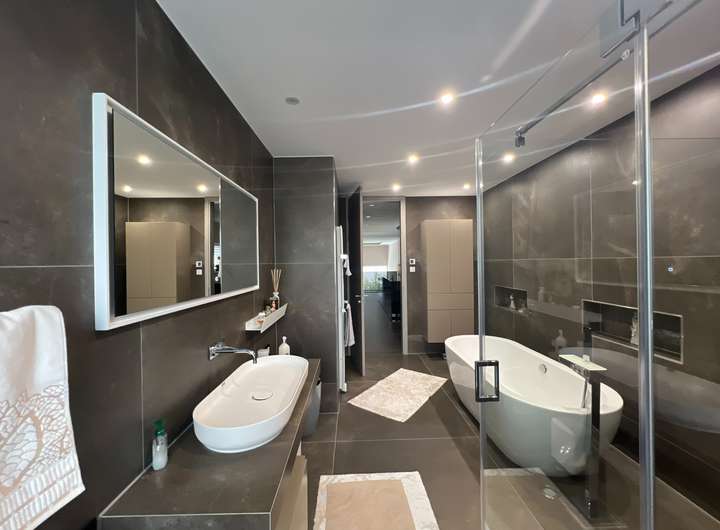 Die moderne, voll ausgestattete Designer-Küche mit ihrem großzügigen Essbereich lässt keine Wünsche offen und erfüllt höchste Ansprüche an Funktionalität und Stil. Die Privatbereiche der Villa begeistern mit großzügigen Schlafzimmern, luxuriösen Bädern sowie flexibel nutzbaren Räumen – perfekt als Home-Office, Studio oder auch als Fitnessbereich.