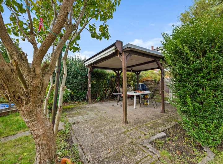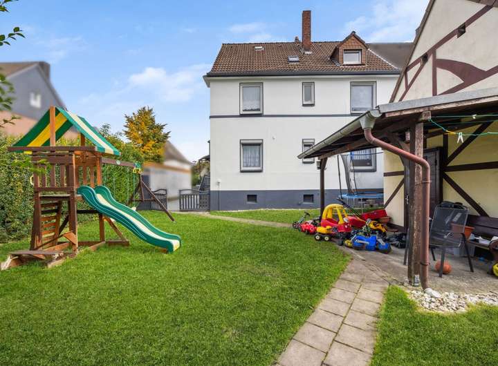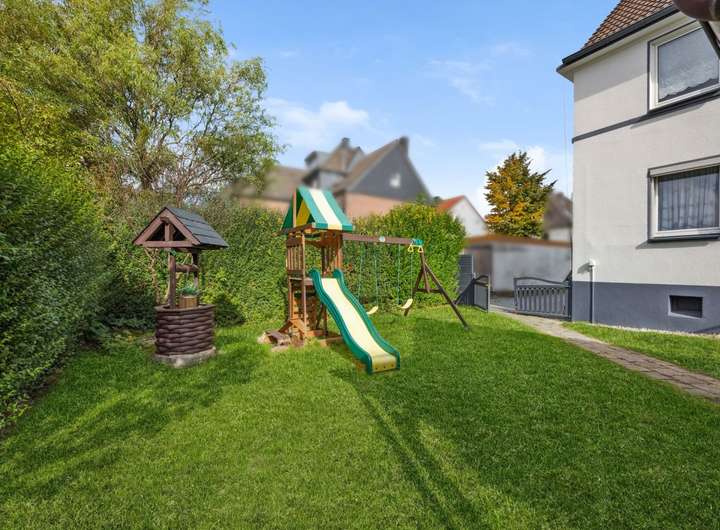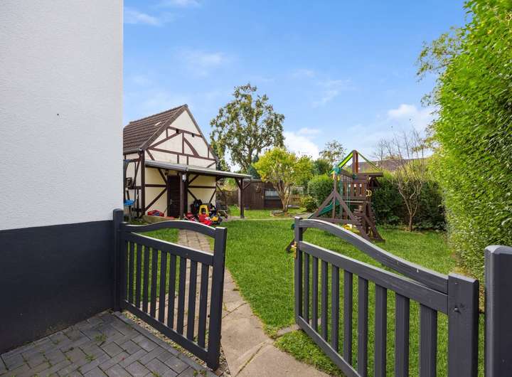 Der Garten bietet ausreichend Platz zum Spielen und verfügt darüber hinaus über ein Gartenhaus sowie einen überdachten Grillplatz.