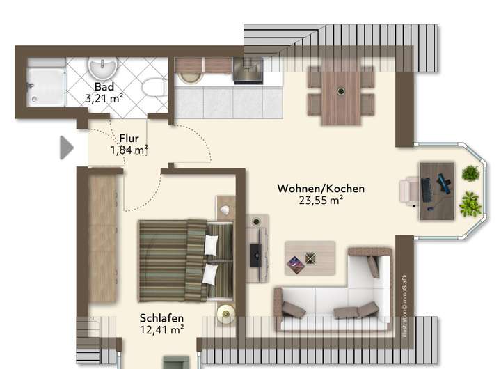 Die Wohnfläche wird gemäß DIN 277 als vermietbare Fläche ausgewiesen und umfasst auch den ca. 6 m² großen Abstellraum im Keller.
