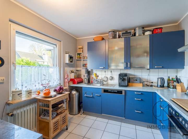 Im Eingangsbereich befindet sich ein kleiner Windfang, von dem aus man direkt in die Küche und in den Wohnbereich gelangt. Die Küche ist funktional geschnitten und bietet alles, was man für den Alltag benötigt. Wer eine moderne Raumwirkung bevorzugt, kann die Küche ohne großen Aufwand mit dem Wohnzimmer verbinden, sodass ein offener Wohn- und Essbereich entsteht.