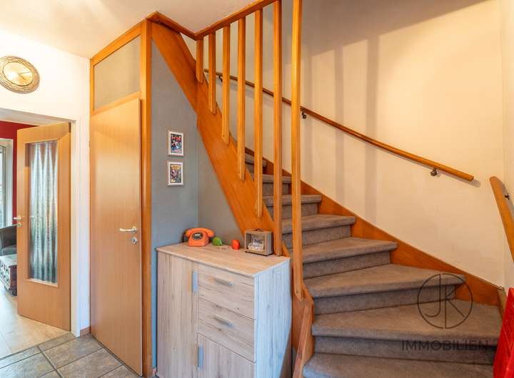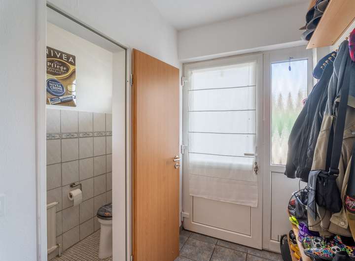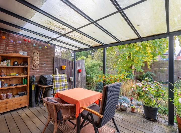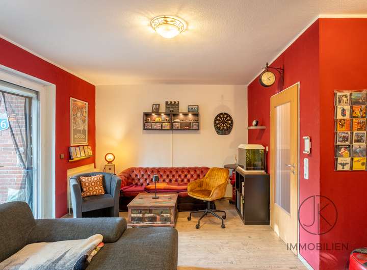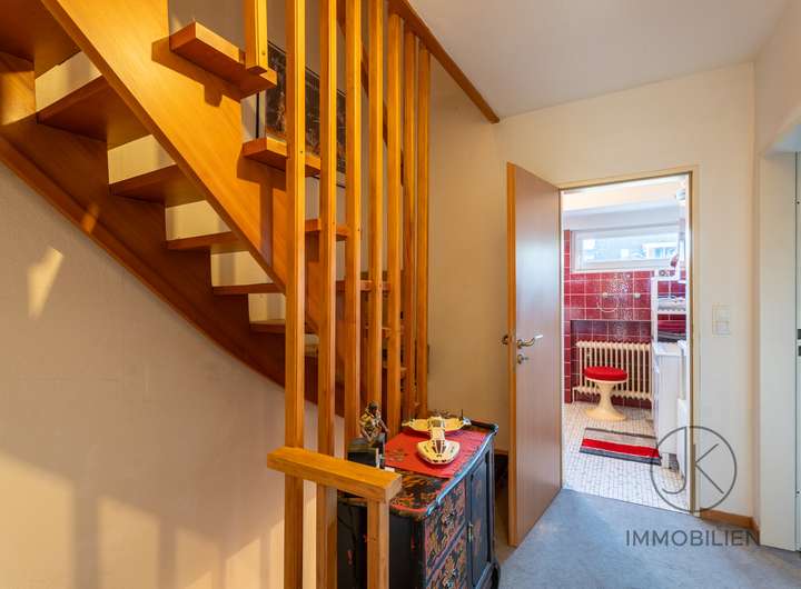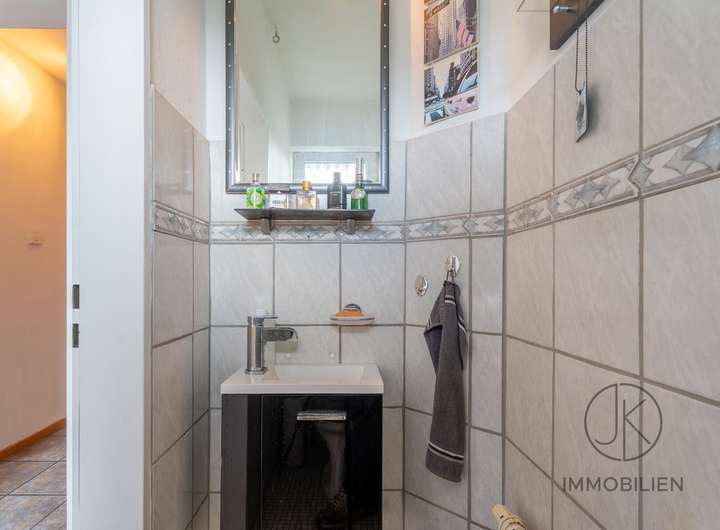 Das Wohnzimmer bietet ausreichend Platz und hat einen direkten Zugang zur überdachten Terrasse. Von hier aus öffnet sich der Blick in den kompakten Garten, der pflegeleicht angelegt ist und über einen kleinen Teich verfügt. Die wettergeschützt verbaute Kelleraußentreppe ist ein praktisches Detail, das den Außenbereich abrundet. Ein Gäste-WC vervollständigt das Erdgeschoss.