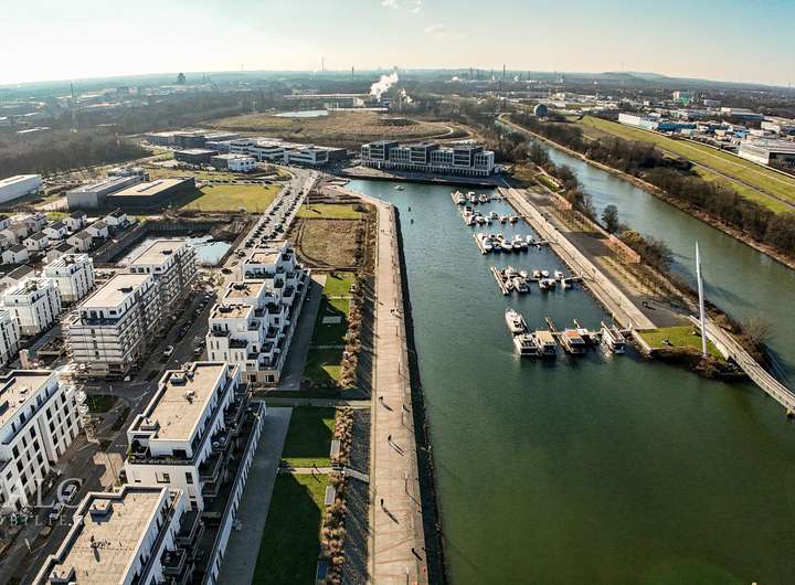Durch große Fensterfronten und Dachterrassen soll nicht nur viel Tageslicht in die zukünftigen Wohnbereiche dringen, sondern auch eine ungestörte Aussicht auf die Marina und den Rhein-Herne-Kanal geboten werden.