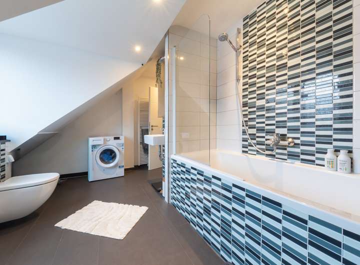 Zurück zum Eingangsbereich befindet sich linksseitig das Tageslichtbadezimmer, hier lädt Sie eine Badewanne zu Entspannen. Durch die praktische Glasabtrennung wird Ihnen aber ebenfalls eine schnelle Dusche ermöglicht. Ein Ort, an dem man sich gerne etwas länger aufhält. Die Gestaltung ist modern und zugleich individuell, der Waschmaschinenanschluss ist praktisch und zugleich komfortabel.