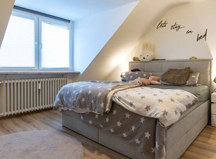 Das Schlafzimmer präsentiert sich als ein besonders behagliches Refugium. Die leichte Dachschräge verleiht dem Raum eine charmante, einladende Atmosphäre, ohne dabei spürbar Platz zu nehmen. Vielmehr entsteht ein harmonisches Raumbild, das sofort ein Gefühl von Geborgenheit vermittelt. Durch den cleveren Grundriss und die angenehme Deckenhöhe bleibt genügend Stellfläche für Bett undKleiderschrank. Das Fenster sorgt für freundliches Tageslicht und lässt den Raum offen und luftig wirken – ideal für erholsame Nächte und entspannte Stunden. Hier entsteht ein Ort, an dem man sich intuitiv wohlfühlt und Träumen erlaubt ist.