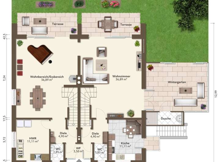 Hinweis: Zur hinteren, rechten Haushälfte gehört ein beheizter Wintergarten mit ca. 32m² Wohnfläche.