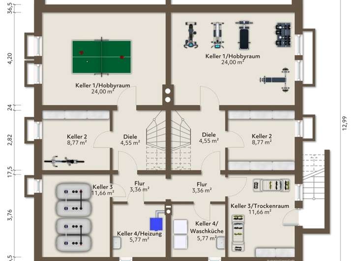 Hinweis: Die Kellergeschosse der beiden Hälften bieten somit zusammen insgesamt 8 Kellerräume, was enormen Stauraum ermöglicht.