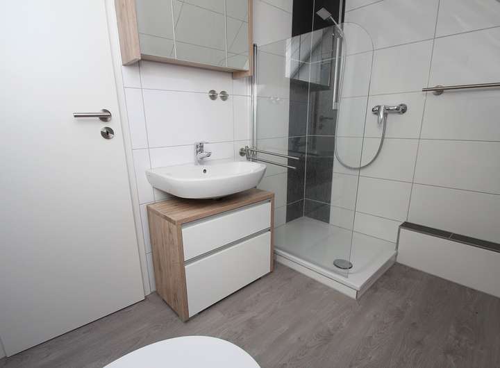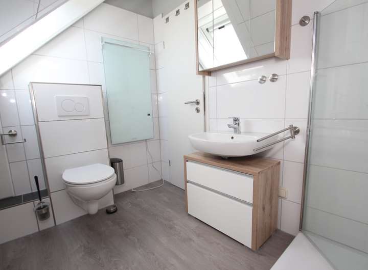 • ein hell, modern gefliestes Duschbad im Obergeschoss verfügt über Fenster, Walk-In Dusche, Spiegelschrank, Waschbecken, Waschbeckenunterschrank und Infrarotheizung mit Appsteuerung.