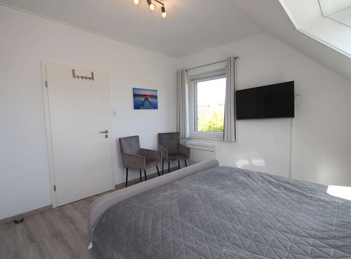 • das Schlafzimmer ist mit einem Doppelbett, Nachttischen, Kleiderschrank sowie Flat-Screen-TV ausgestattet
