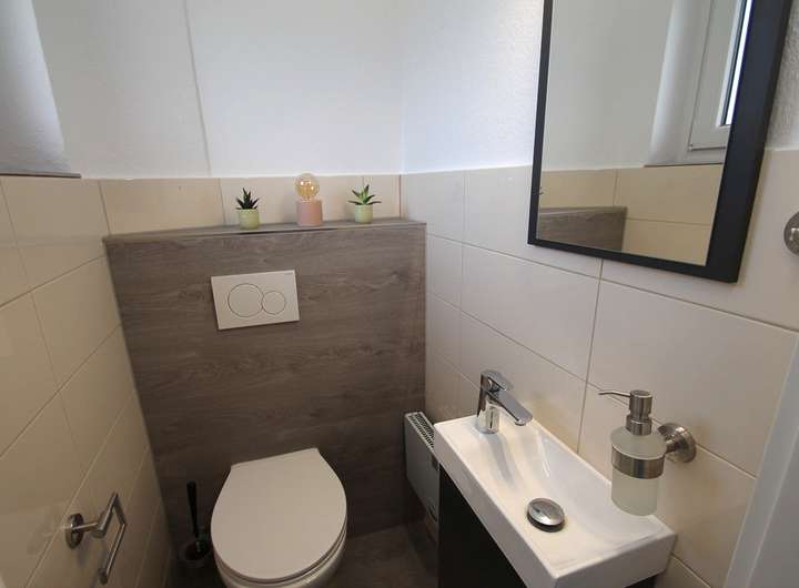 • modernes Gäste-WC im Erdgeschoss mit Waschbecken und Fenster