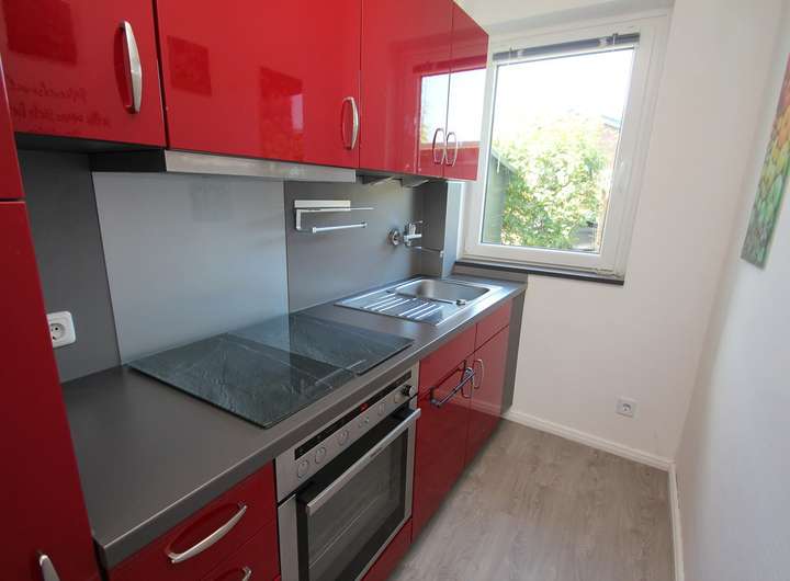 • die zeitlose Einbauküche im ansprechenden Design ist gut ausgestattet. Sie verfügt über Dunstabzugshaube, Spülbecken, Backofen, Kühlschrank mit Gefrierfach sowie ein Ceran-Kochfeld