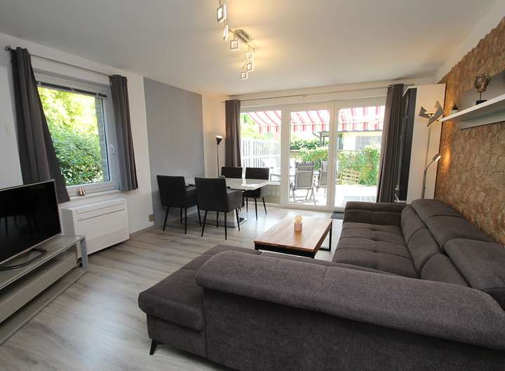 • der lichtdurchflutete und geschmackvoll eingerichtete Wohn-/ Essbereich überzeugt mit Terrassenzugang, Flat Screen-TV, einem Esstisch mit Platz für 4 Personen, einer Wohnlandschaft mit Schlaffunktion, Couchtisch und Vitrinen Schrank