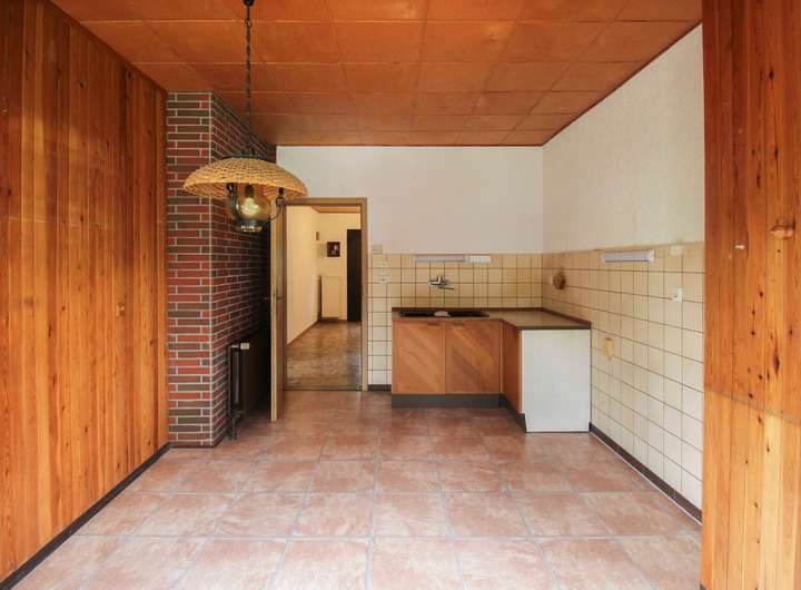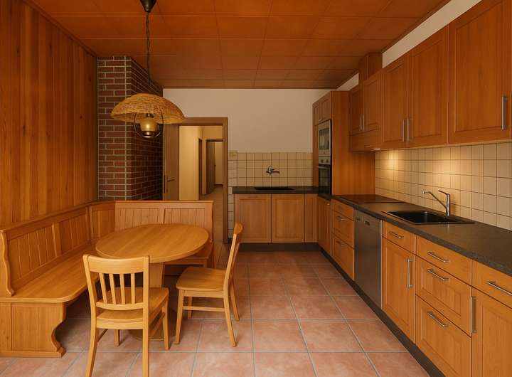 Im Erdgeschoss erwartet Sie ein großzügiges Wohnzimmer mit viel Tageslicht und angenehmer Deckenhöhe von ca. 2,59 m. Der Raum lässt sich bei Bedarf problemlos in zwei separate Zimmer unterteilen. Ebenfalls im Erdgeschoss befinden sich eine Küche sowie ein Badezimmer mit Badewanne. Die Küche ist mit elektrischen Rollläden ausgestattet, während im restlichen Haus manuelle Jalousien verbaut sind.
