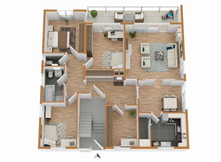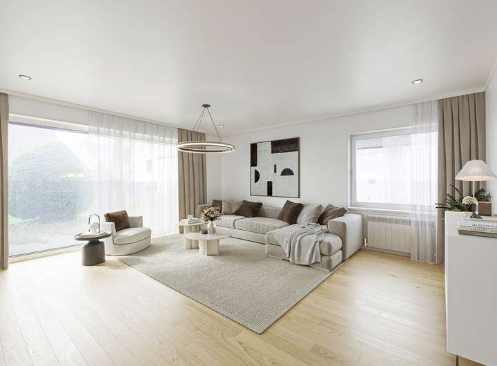 Die Erdgeschosswohnung besticht durch einen großzügigen Wohn- und Essbereich mit großen Fensterfronten, die viel Tageslicht hereinlassen und den Blick in den schönen Garten freigeben. Vom Wohnzimmer aus gelangen Sie direkt auf die die großzügige Terrasse. Vom Essbereich aus haben Sie zusätzlich noch Zugang zu einer weiteren, möglichen Terrasse, diese ist aber aktuell nicht vorhanden. Die separate Küche verfügt über eine praktische Speisekammer. Der private Bereich umfasst ein Schlafzimmer sowie drei weitere Zimmer, die flexibel als Kinder-, Gäste- oder Ankleidezimmer genutzt werden können. Ein Tageslichtbad und ein separates WC runden das Raumangebot ab.
