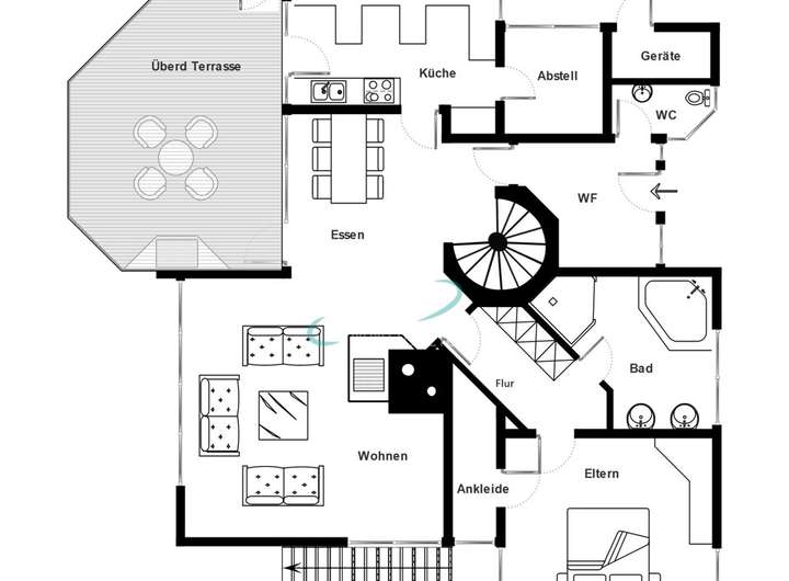 Im Erdgeschoss befindet sich ein großzügiger Wohn- und Essbereich mit bodentiefen Fenstern, der für eine angenehme Lichtdurchflutung sorgt. Der Kamin im Wohnzimmer schafft dabei eine behagliche Atmosphäre. Vom Wohnbereich aus ist der Zugang zur überdachten Terrasse möglich, die zum Verweilen im Freien einlädt. Die Küche bietet einen direkten Zugang zum angrenzenden Abstellraum.
