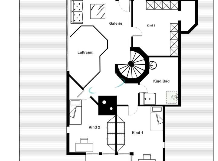 Das Obergeschoss verfügt über drei Schlafzimmer, ein Bad sowie einen Balkonzugang. Die sichtbaren Holzbalken und die weiße Holzdecke sorgen in den Räumen für ein wohnliches Flair. Eine Galerie bietet Ihnen viel Platz und kann flexibel genutzt werden – z. B. als Arbeitsbereich.