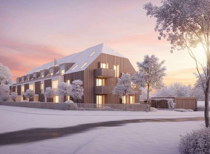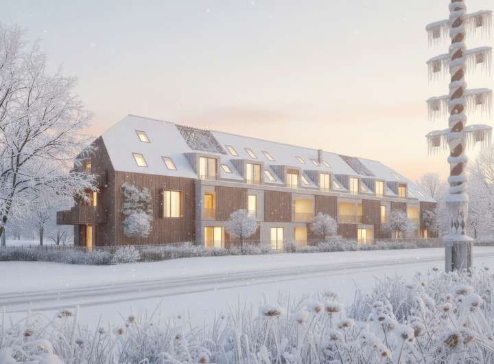 Die Erdgeschoss-Wohnung Nummer 12 ist nach Westen zum Garten ausgerichtet und bietet einen ruhigen, grünen Blick, der auch die Gemeinschaftsfläche mit Außenküche umfasst. Diese Lage verbindet die Annehmlichkeiten des städtischen Lebens mit der Ruhe und Schönheit der Natur. Der direkte Zugang zum Garten und die westliche Ausrichtung garantieren sonnige Stunden und spektakuläre Sonnenuntergänge. Die Umgebung bietet eine entspannte Atmosphäre und lädt zum Relaxen ein.