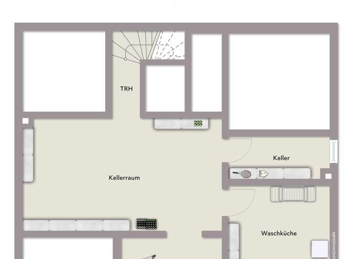 Der Keller, teilweise in den Hang gebaut, verfügt über Fenster und einen direkten Außenzugang. Das Haus ist nur zum Teil unterkellert und bietet somit praktische Lagermöglichkeiten.