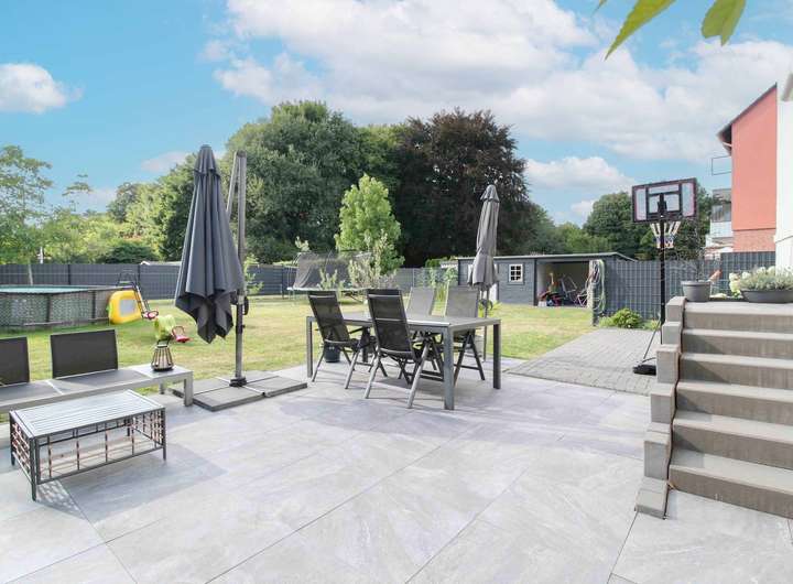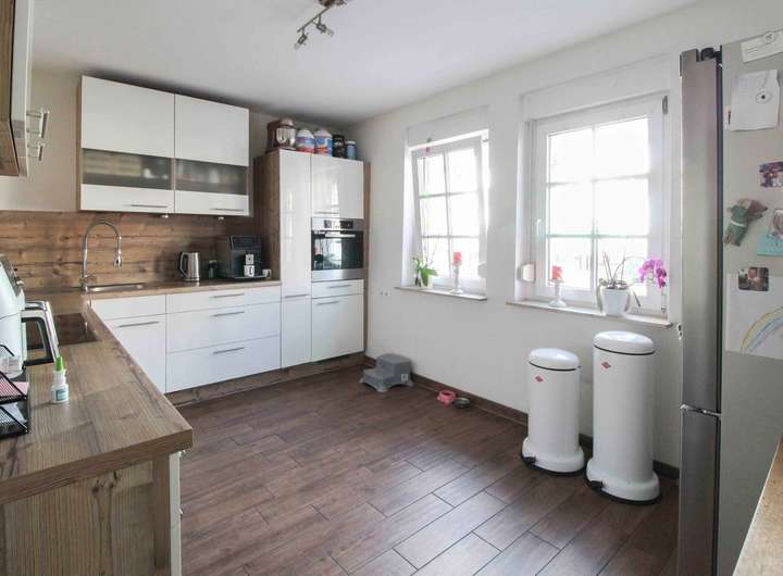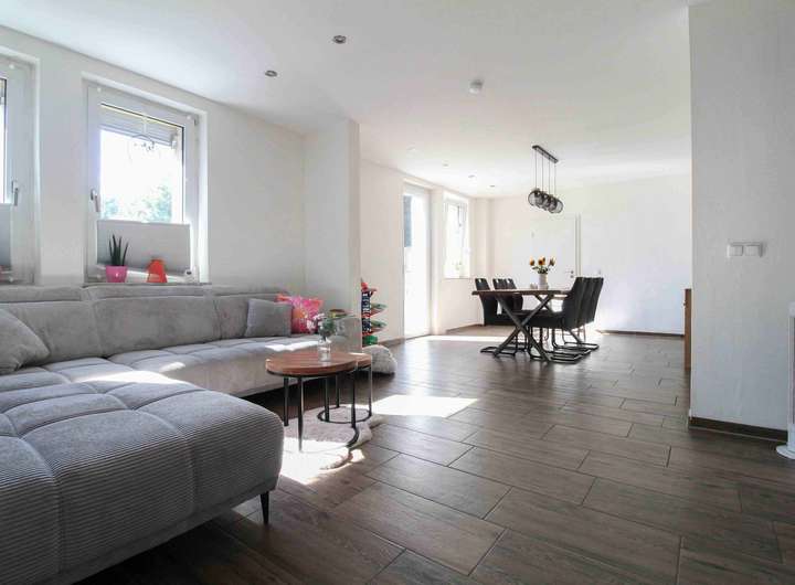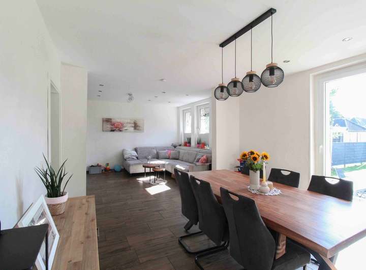Die rechte Haushälfte (Hausnummer B) wurde im Jahr 2016 umfassend von einem Dreifamilienhaus zu einem großzügigen Einfamilienhaus umgebaut und modernisiert. Mit einer Wohnfläche von insgesamt 189,68 m² überzeugt hier vor allem der direkte Zugang vom großen, offenen Wohnbereich in den gepflegten Garten, der ideale Rückzugsmöglichkeiten bietet und viel Raum für Familienleben schafft. Eine neu gepflasterte Einfahrt mit umzäunten Stellplätzen rundet das Gesamtbild ab und gewährleistet sowohl Komfort als auch Privatsphäre.