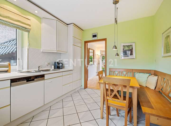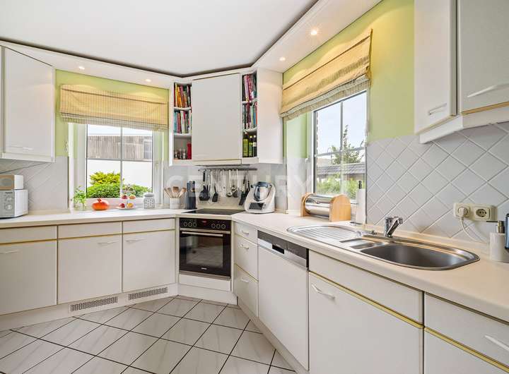 Auf der unteren Ebene des Hauses befinden sich der geräumige und helle Wohn- und Essbereich mit vorhandenem Kaminanschluß, die voll funktionsfähige Küche mit pfiffigen Einbauten (Ecklösung) und erneuerten Elektrogeräten sowie die Diele mit Garderobe und Zugang zum Gäste-WC und einem geräumigen Abstellraum.