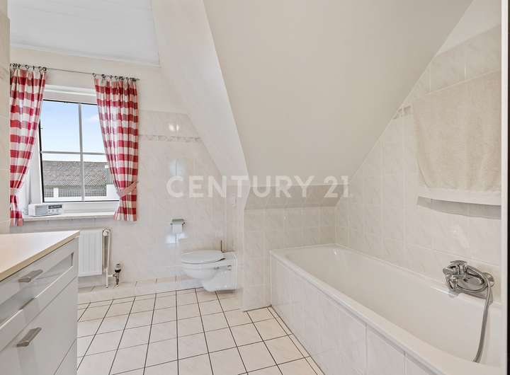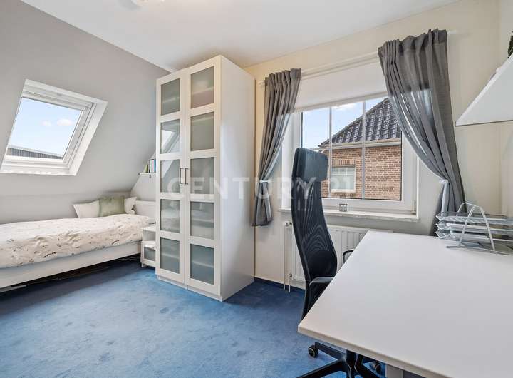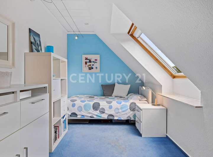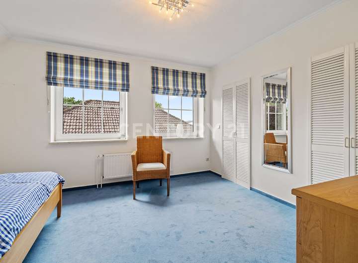 Im Obergeschoss gibt es neben dem imposanten Elternschlafzimmer mit praktischen Einbauschränken zwei weitere Räume (alle mit Teppichboden) und ein schönes großes Vollbad.