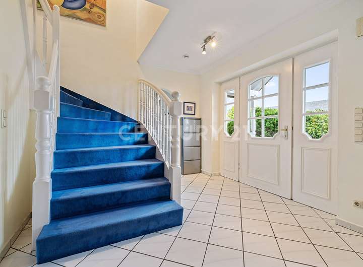 Der einladende Eingangsbereich mit stilvoller zusätzlicher Giebelüberdachung zieht alle Blicke auf sich und schafft ein beeindruckendes Entree zum einladenden und großzügigen Dielenbereich mit der ästhetischen Treppe ins Obergeschoss.