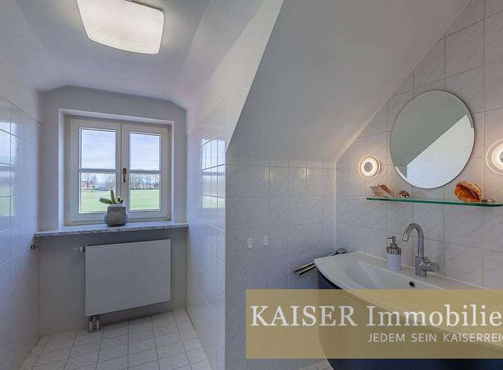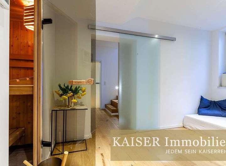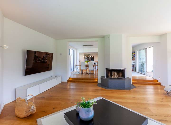 Das behagliche Landhaus ist angelegt über Erdgeschoss, Obergeschoss und ein voll ausgebautes Untergeschoss. Im Erdgeschoss wurden einige Wände entfernt und neue Fenster angebracht. Die Küche ist offen gestaltet und geht in den Wohnraum mit offenem Kamin und neuem Panoramafenster über. Hier befinden sich neben dem Eingang eine Gästetoilette und ein Büroraum mit hübscher Westterrasse. Das untere Geschoß ist über einen separaten Zugang begehbar und kann als Büro, Einliegerwohnung oder je nach Bedarf genutzt werden. Hier könnte man auch durch Einziehen einer Wand eine komplette Trennung ohne viel Aufwand ermöglichen. Das Haus ist voll unterkellert, hier befinden sich neben der Sauna und zwei Abstellräumen ein weiterer Raum, der derzeit als Fitnessraum genutzt wird. Im oberen Geschoss befinden sich zwei größere und ein kleineres Schlafzimmer ( oder 2. Ankleidebereich) sowie zwei großzügige Bäder. Entlang des Flurs ist Platz für Kleidung, vom oberen Stock ist bei klarer Sicht teilweise sogar ein Bergblick zu erhaschen.