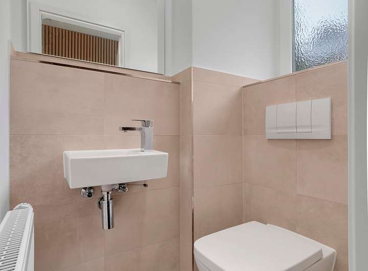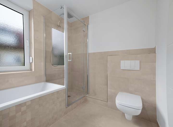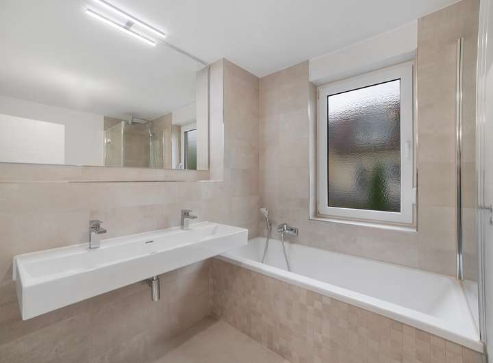 Auch für die modernisierten Bäder wurden nur ausgewählte Materialien verwendet. Böden und Wände sind mit hochwertigem und durchgefärbten Feinsteinzeug der Marke Atlas Concord gefliest - eine ideale Kombination von Ästhetik und hoher Beanspruchbarkeit. Die Bäder wurden fachgerecht abgedichtet, neue WC- und Waschtischmodule verbaut und mit Trockenbau verkoffert. Die Bäder wurden abschließend mit neuen Marken-Sanitärobjekten und -Armaturen (Ideal Standard, Hans Grohe, etc.) ausgestattet. Der nahezu ebenerdige Duschbereich wurde mosaikgefliest und verfügt über eine Regendusche.
