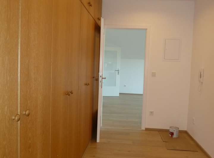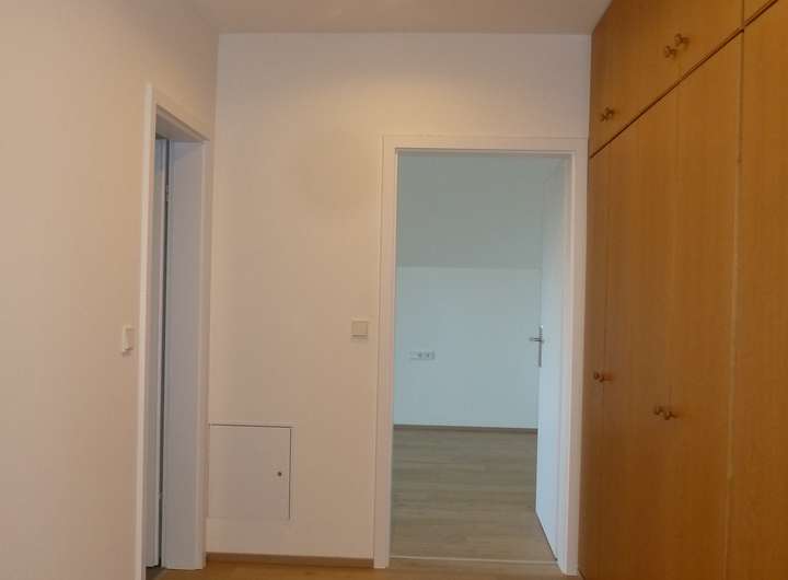 Im geräumigen Durchgangsflur zum Bad und schönen Schlafzimmer ist ein Einbauschrank die optimale Lösung als Kleiderschrank und um Besen, Staubsauger & Co. verschwinden zu lassen.