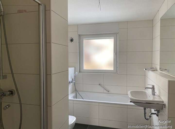 - Tageslichtbad mit Waschtisch, Wanne, Dusche, WC, sep. Gäste-WC, wandhängend, Einhandarmaturen, hochwertige/Standard Gegenstände, Farbe: weiß, raumhoch gefliest mit hellen, großformatigen Fliesen