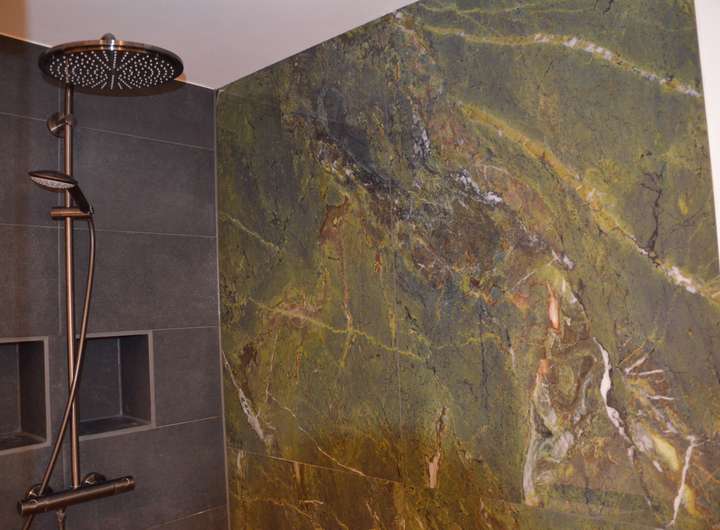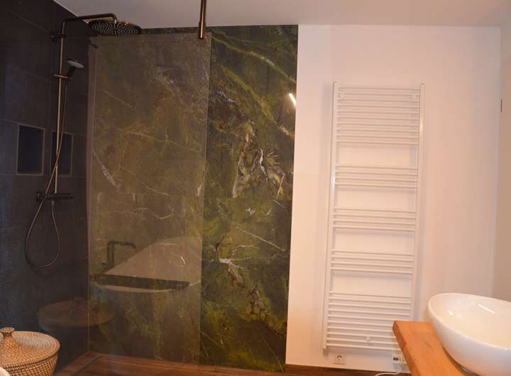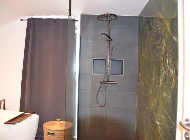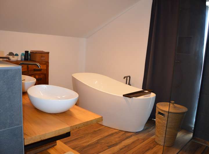 Erleben Sie Wellness auf höchstem Niveau – mit einer freistehenden Designer-Badewanne, einer edel gefliesten Walk-in-Dusche (1,2 × 1,5 m) in sattem Grün, warmem Lichtkonzept und einem Ambiente, das zum Verweilen einlädt.
