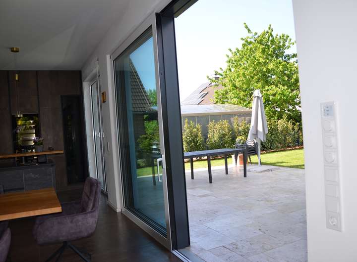 • 4 m breites Hebeschiebe-Element zur sonnigen Südwest-Terrasse (50 m²) – für fließende Übergänge zwischen Innen und Außen.