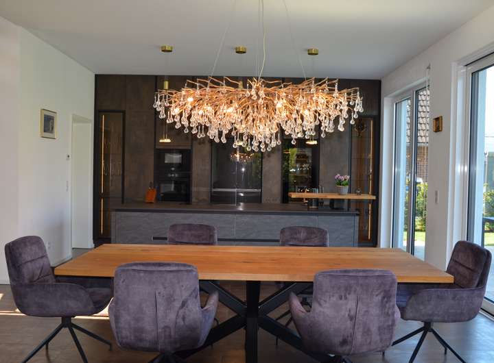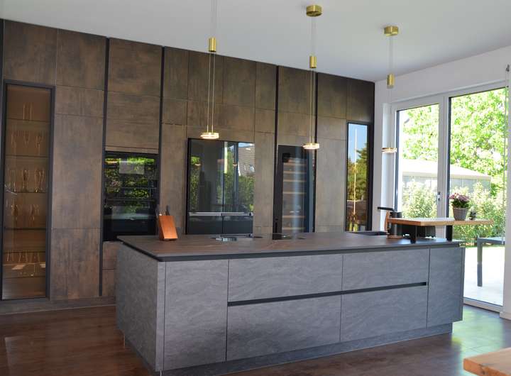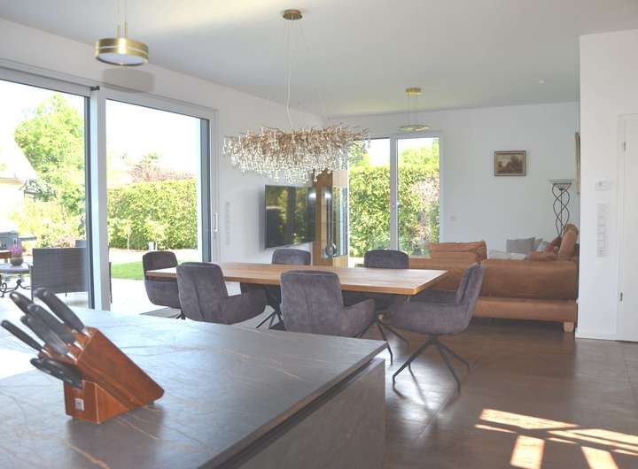 Im Erdgeschoss öffnet sich ein großzügiger Wohn- und Essbereich, der durch seine Offenheit und Gestaltung begeistert. Herzstück ist die hochwertige Traumküche, die Profiansprüchen mehr als gerecht wird: